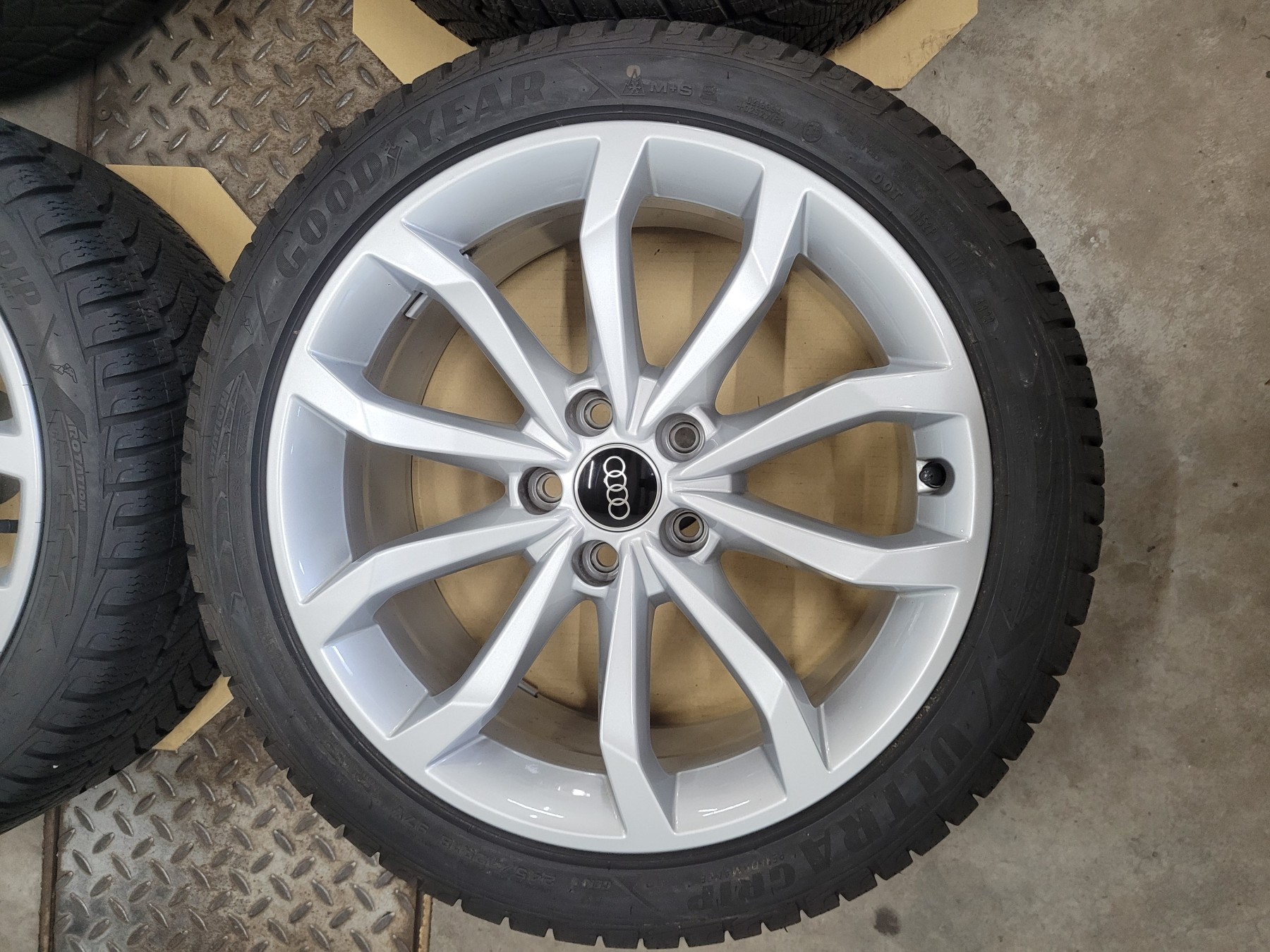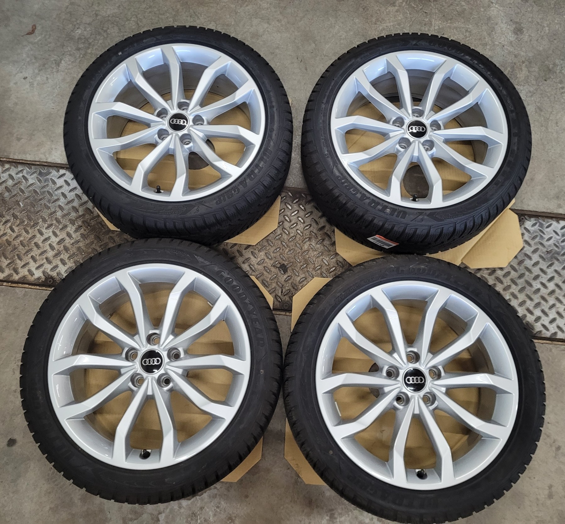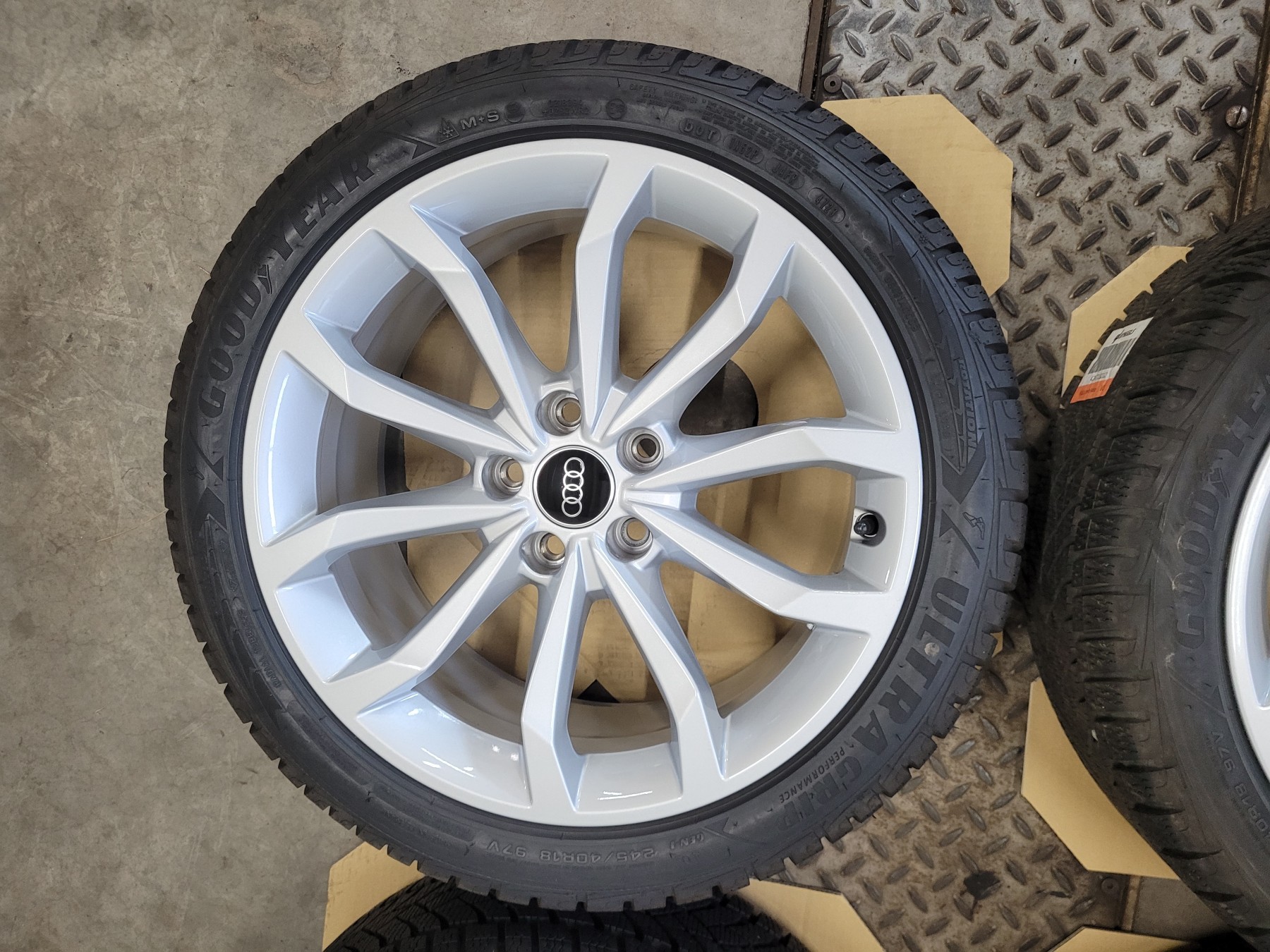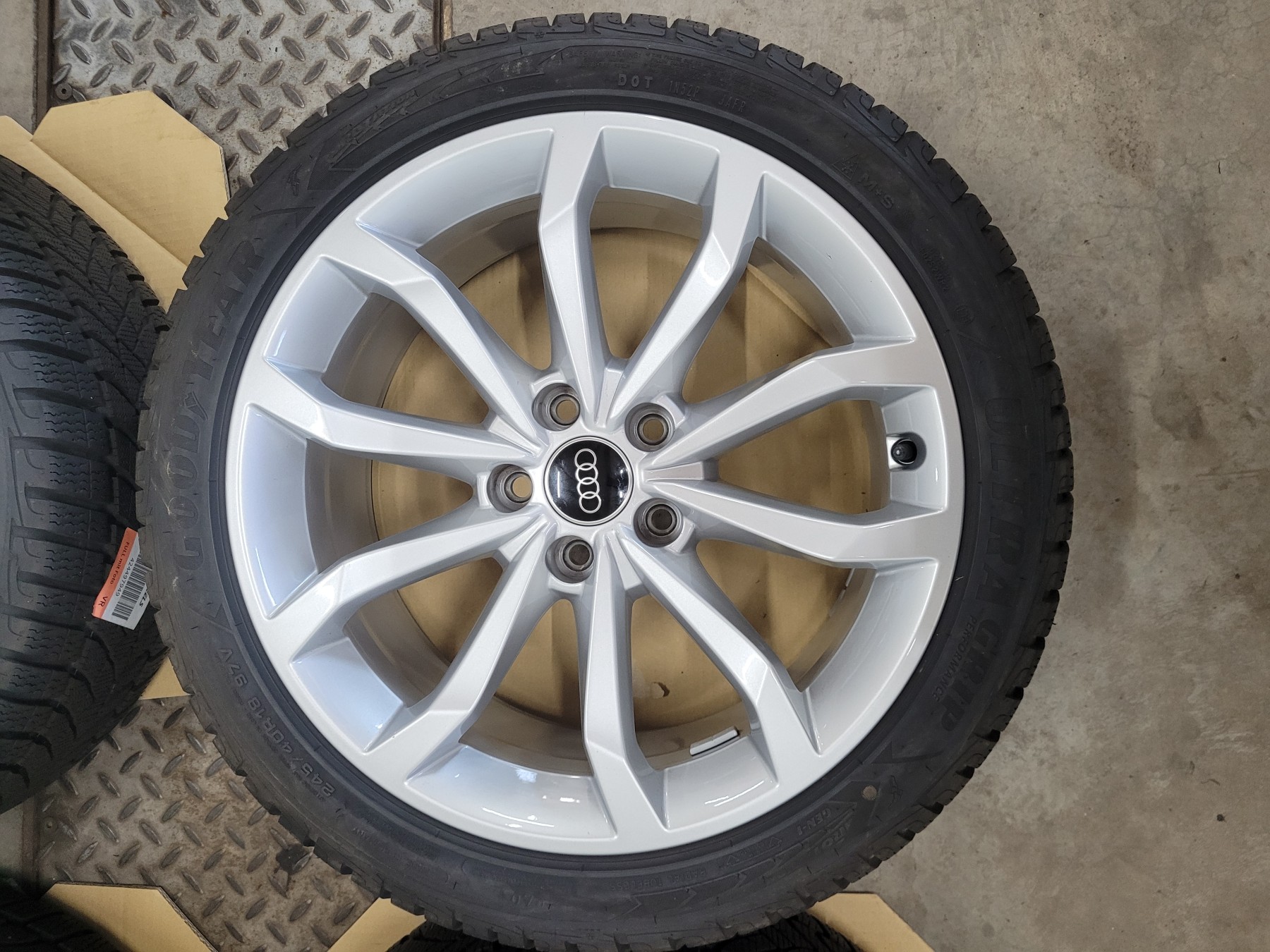 4 Stk. Alufelgen Audi 8x18 et40 5x112 66,6 Herstellerartikelnummer: 8W0601025H Silber - mit Nabenkappe 1 Satz Felgen 1.250€ Ohne Beschädigungen, natürlich nichts nachlackiert oder nachträglich repariert. Felgen sind komplett neu und unbeschädigt. Stammen von Neufahrzeugen demontiert ca. 50km gefahren! Montiert sind 245/40R18 97V Goodyear Ultra Grip Perfomance Winterreifen DOT4723 mit AO Audi Kennung.