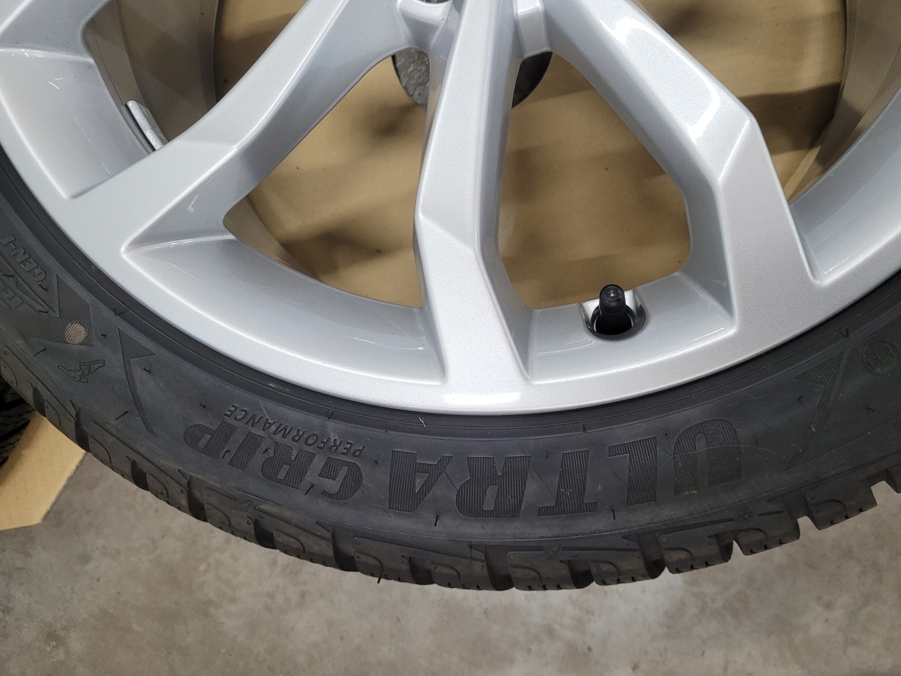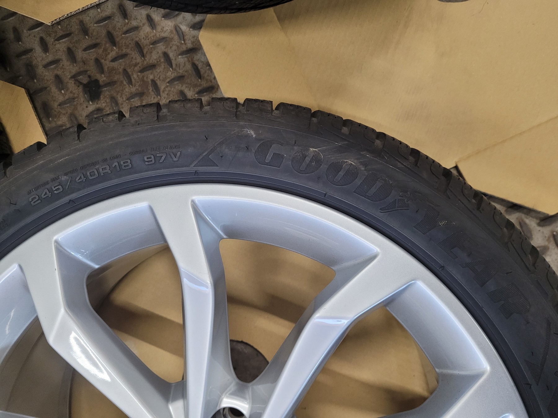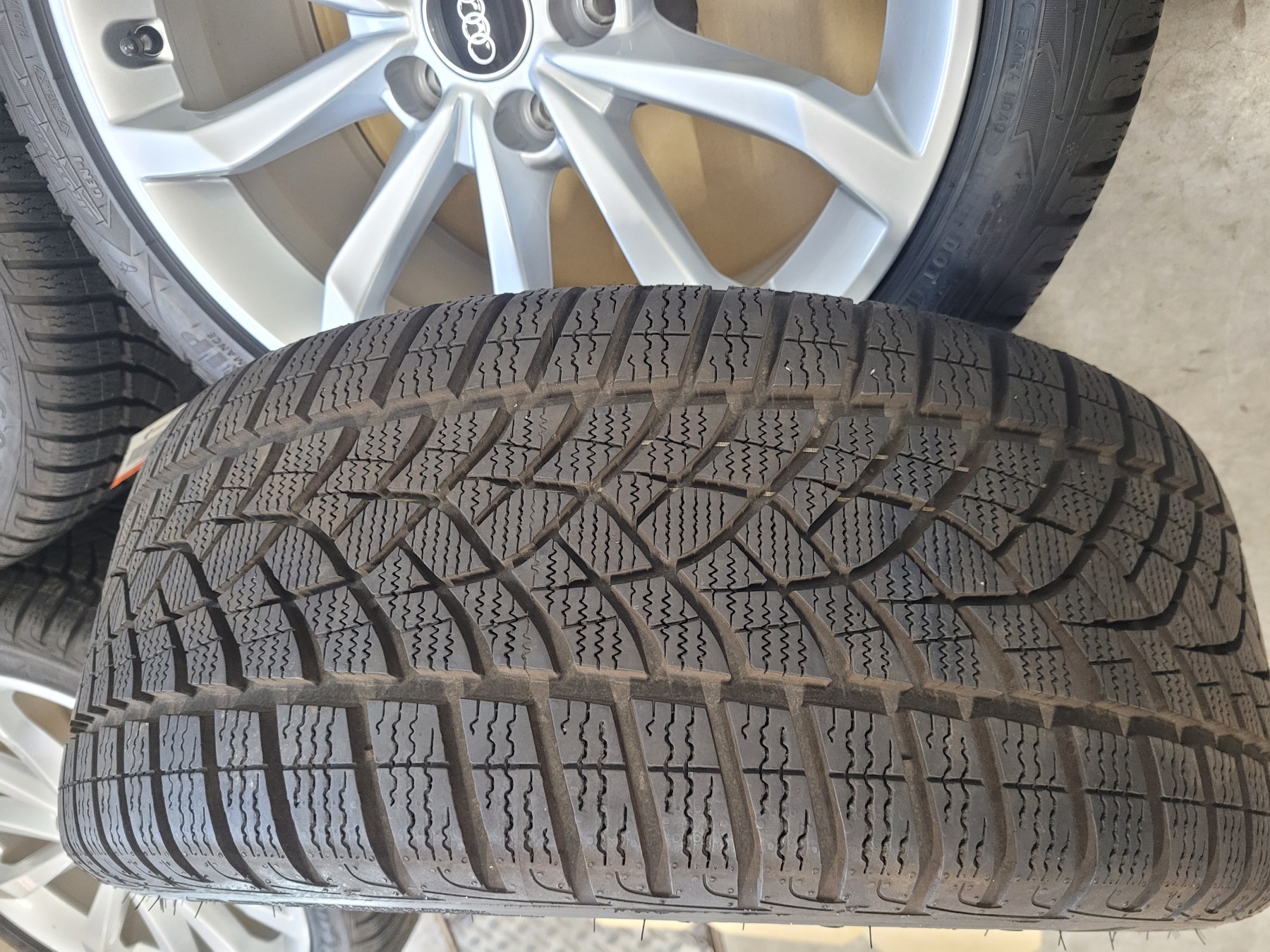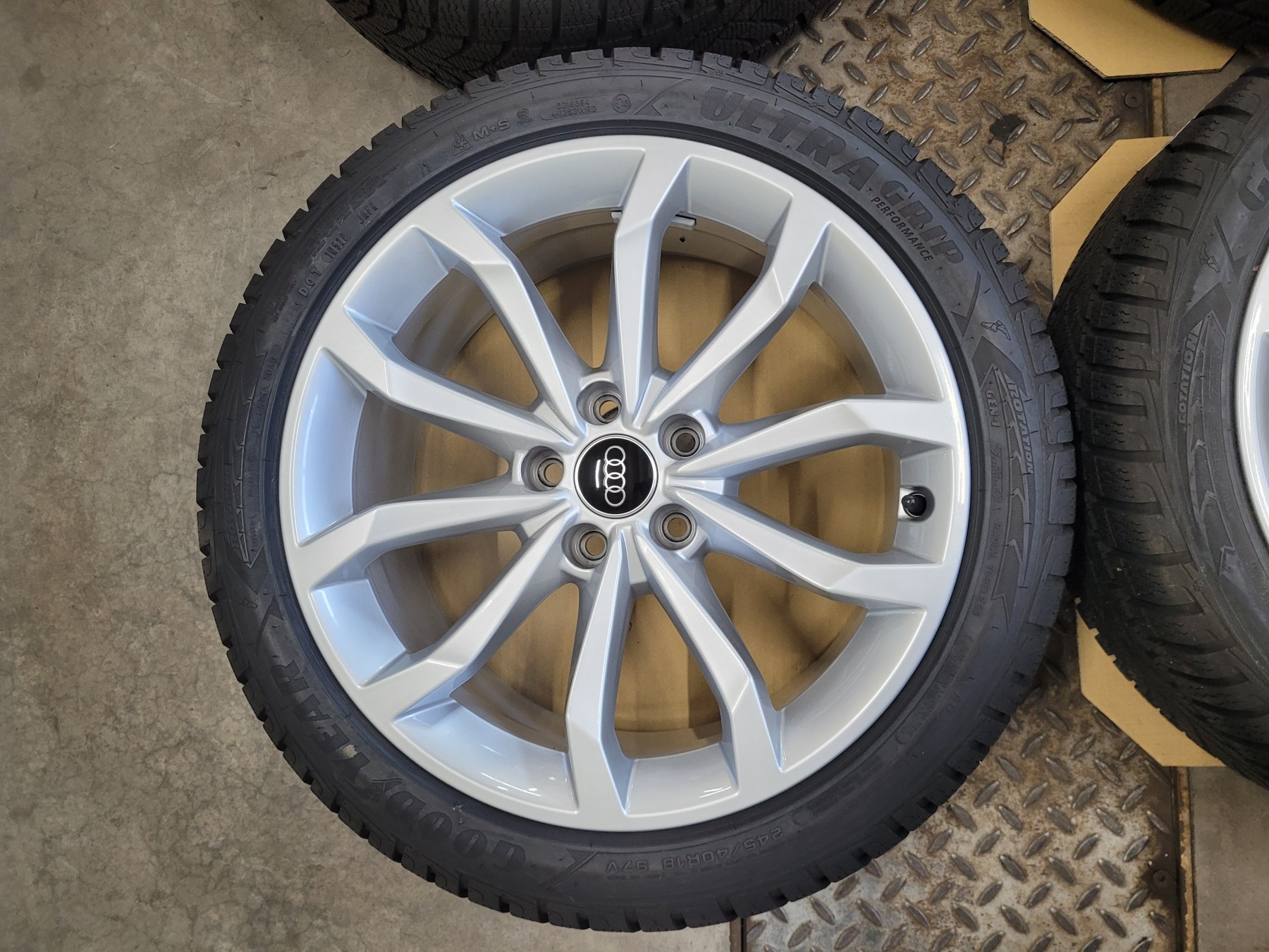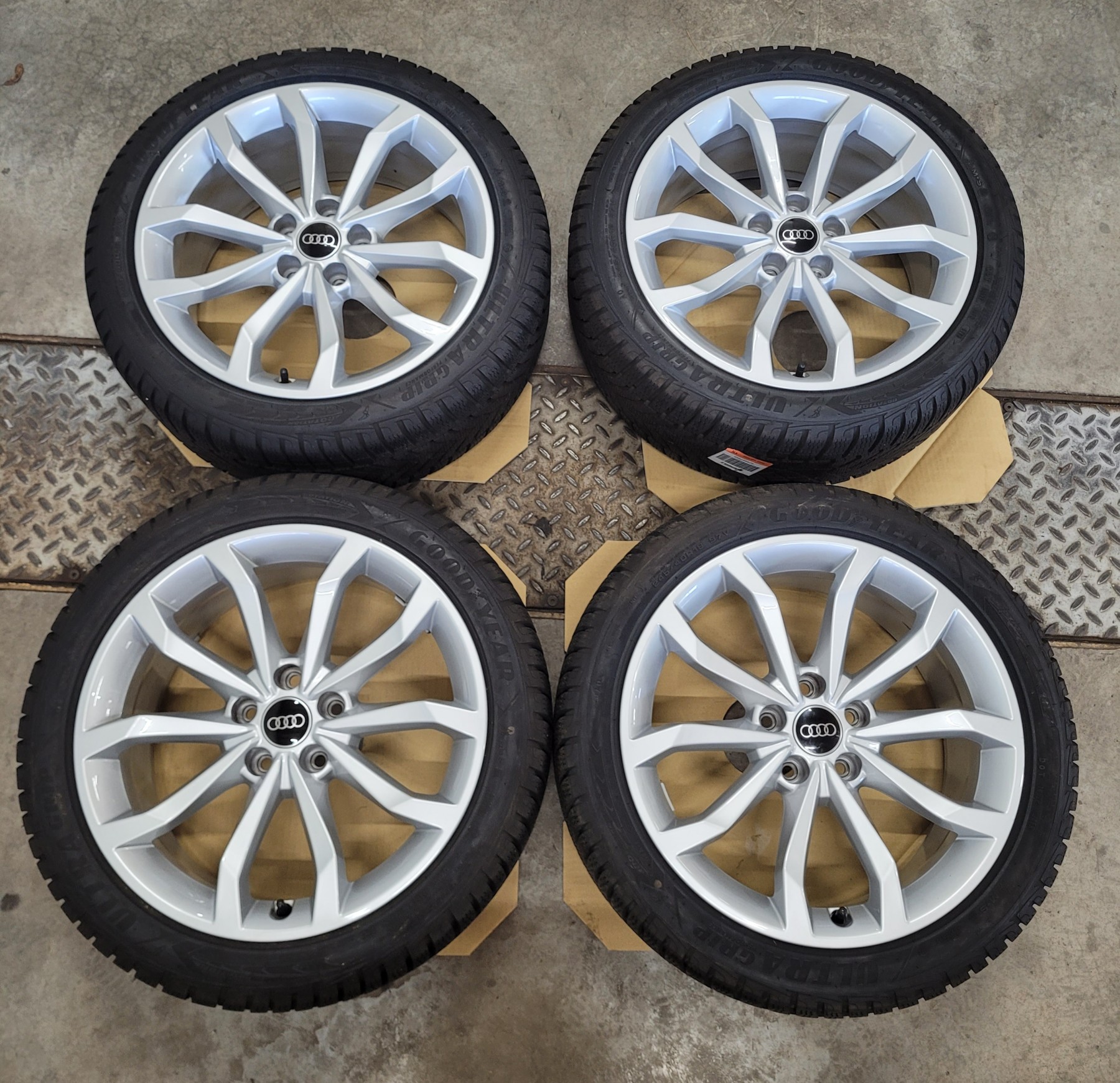 4 Stk. Alufelgen Audi 8x18 et40 5x112 66,6 Herstellerartikelnummer: 8W0601025H Silber - mit Nabenkappe 1 Satz Felgen 1.250€ Ohne Beschädigungen, natürlich nichts nachlackiert oder nachträglich repariert. Felgen sind komplett neu und unbeschädigt. Stammen von Neufahrzeugen demontiert ca. 50km gefahren! Montiert sind 245/40R18 97V Goodyear Ultra Grip Perfomance Winterreifen DOT4723 mit AO Audi Kennung.
